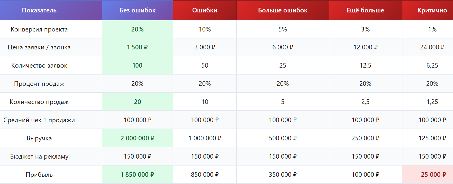 🤑 Но стоит начать косячить, так сразу падает конверсия проекта, падает количество заявок, падает выручка. А в последней колонке вообще реклама невыгодна. Запомните: чем больше ошибок на сайте и в рекламе, тем меньше выручки вы получите!